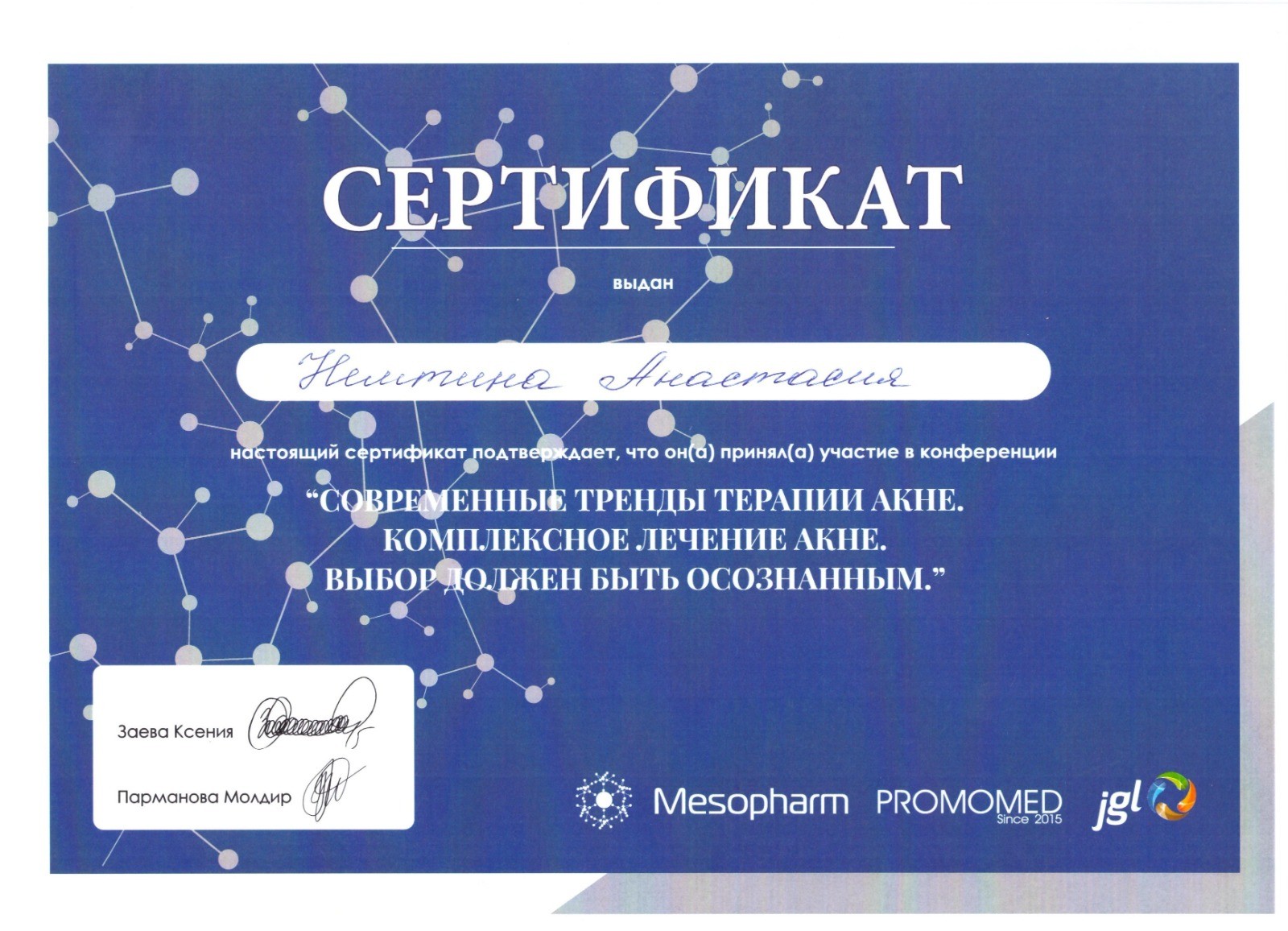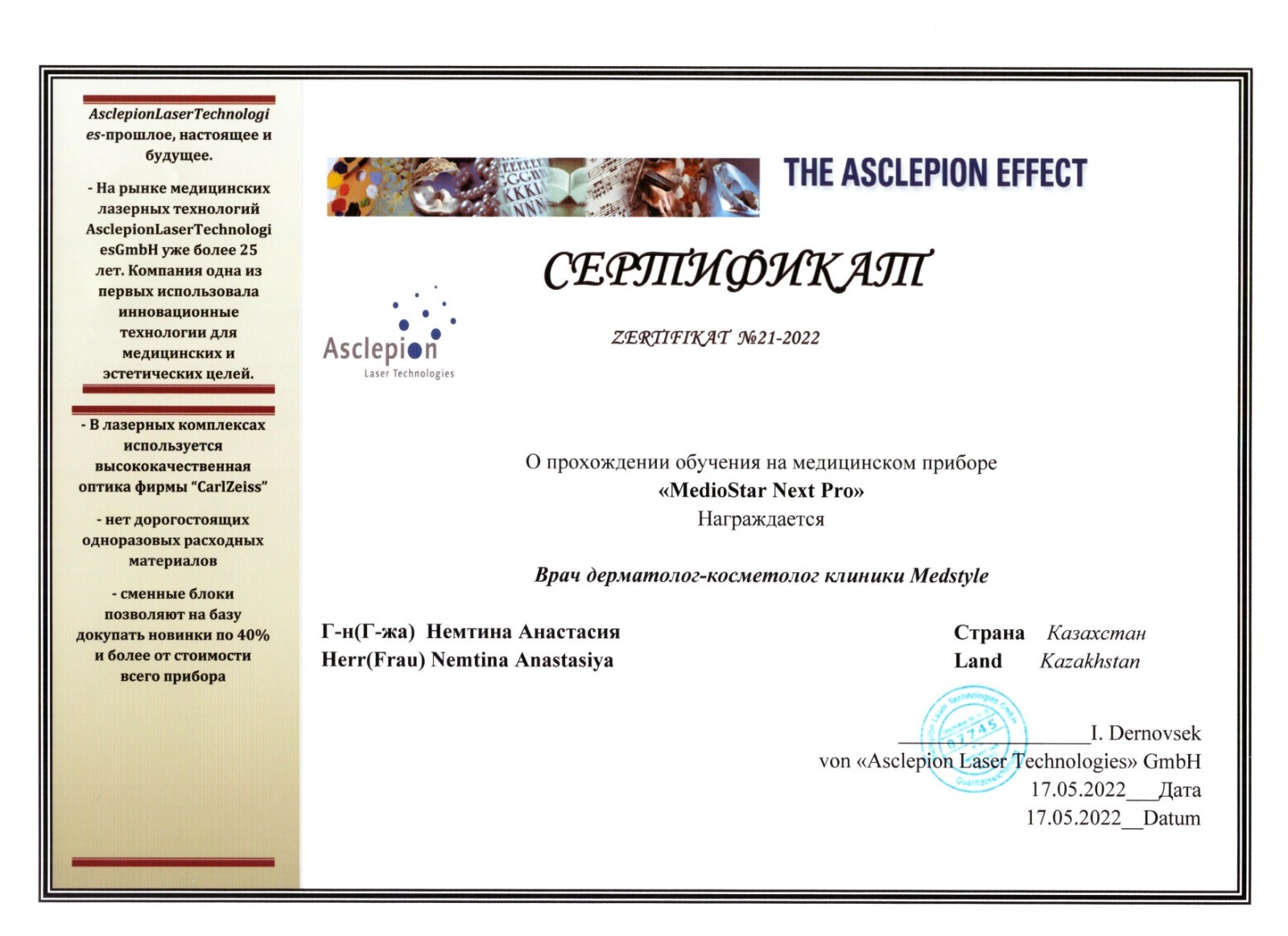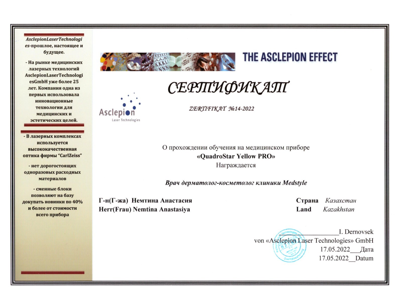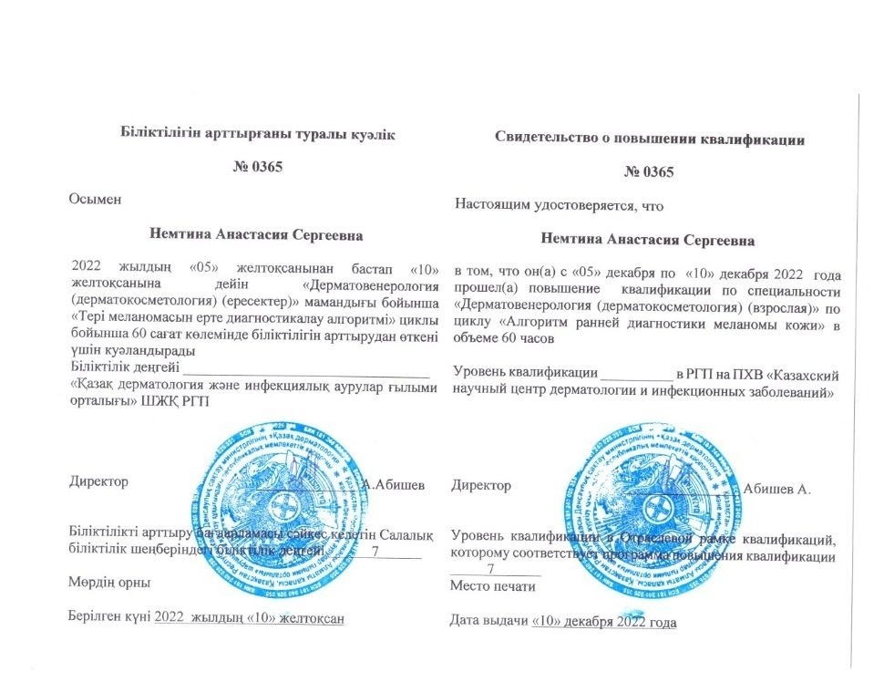 Прошла повышение квалификации по специальности «Дерматовенерология (дерматокосметология) (взрослая)» по циклу «Алгоритм ранней диагностики меланомы кожи» в объеме 60 часов.