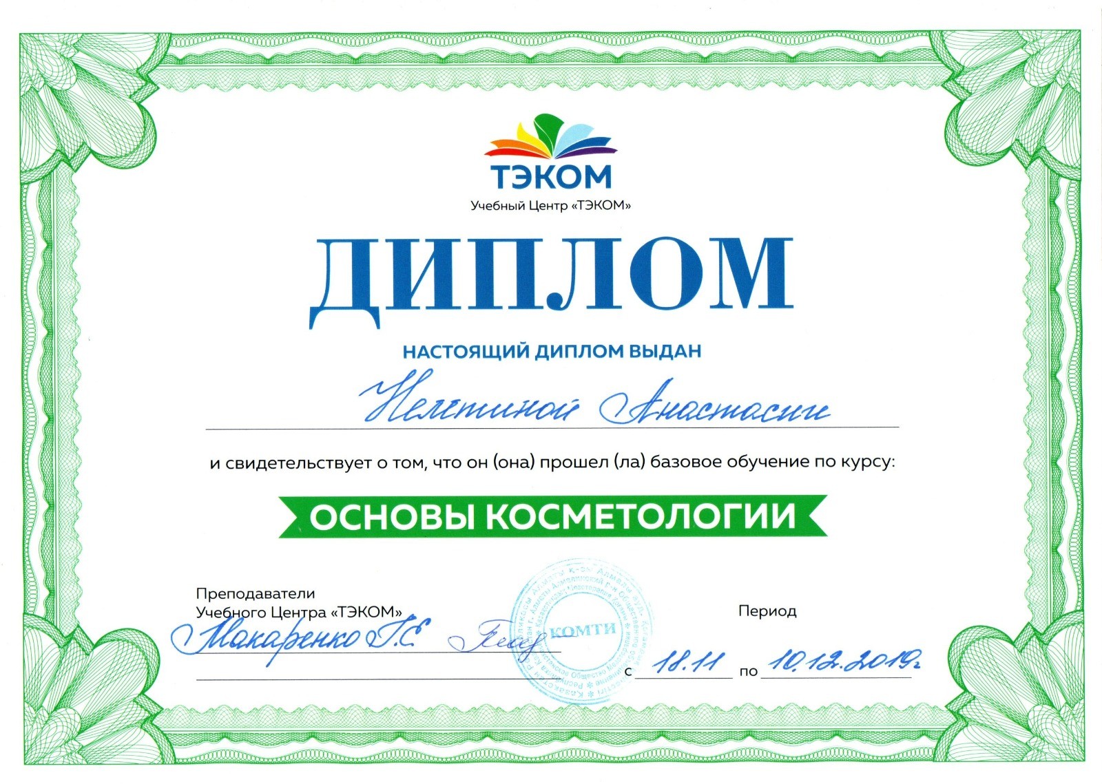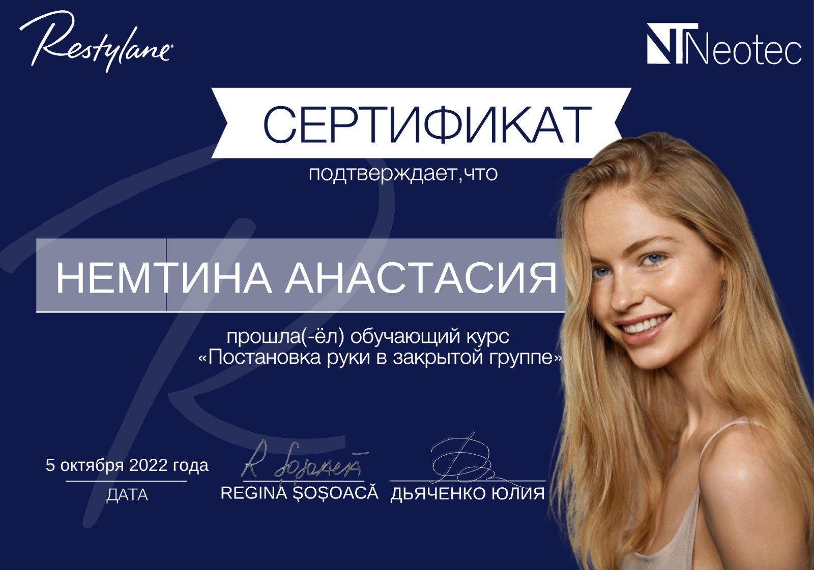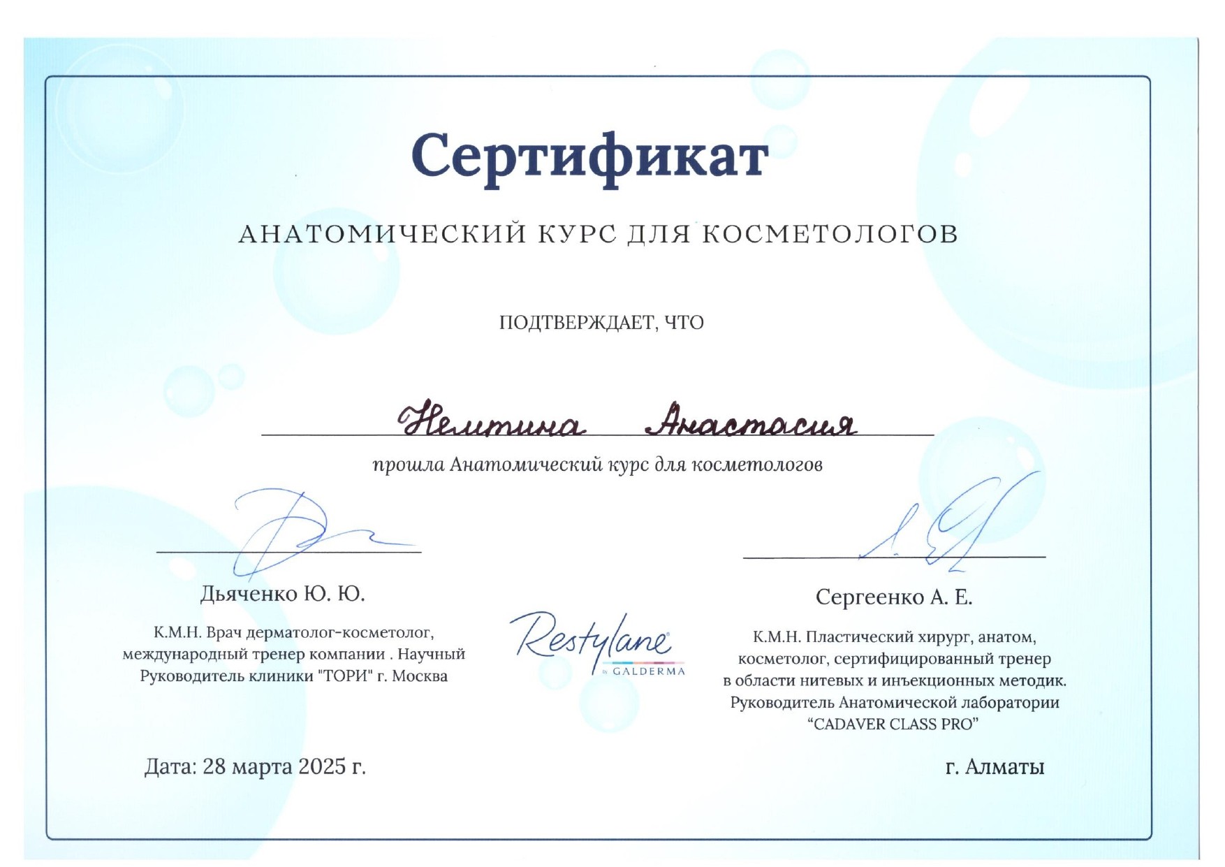 Прошла повышение квалификации по специальности «Дерматовенерология (дерматокосметология) (взрослая)» по циклу «Алгоритм ранней диагностики меланомы кожи» в объеме 60 часов.