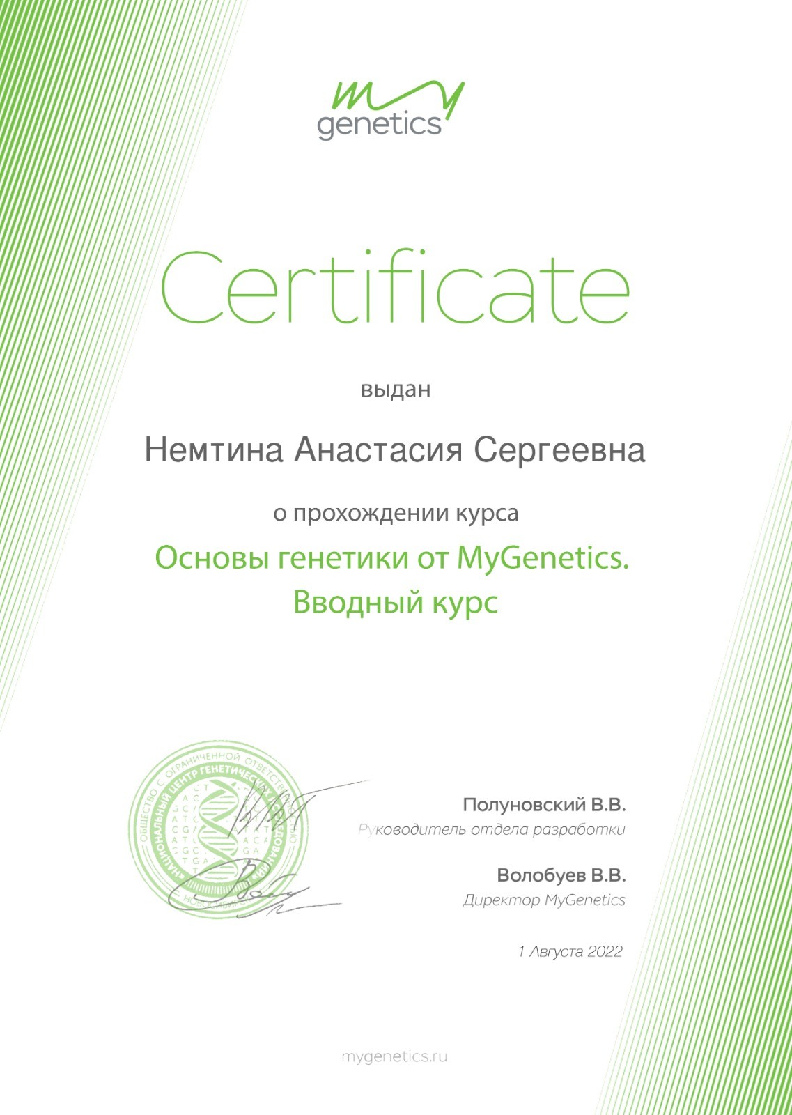 Прошла курс «Основы генетики от MyGenetics. Вводный курс.»
