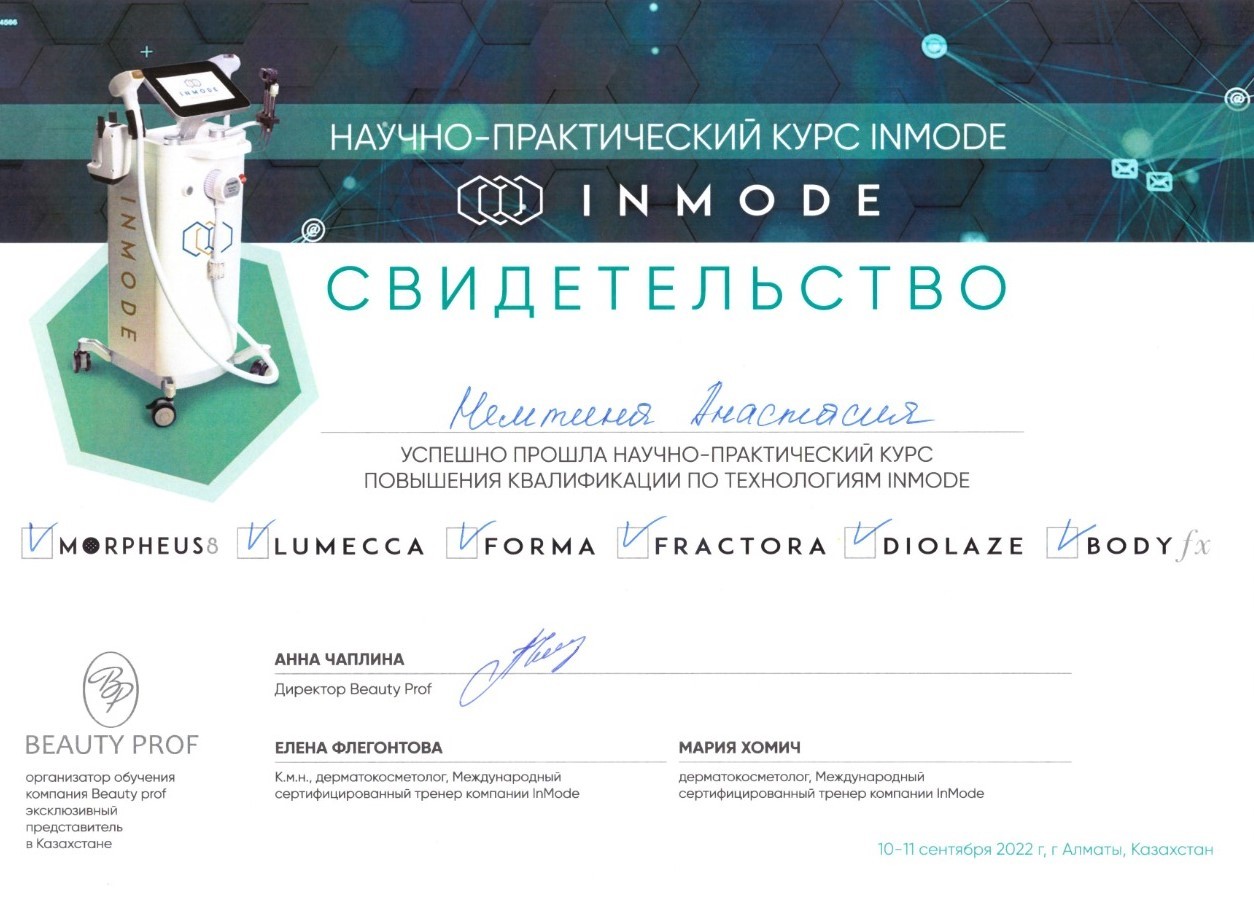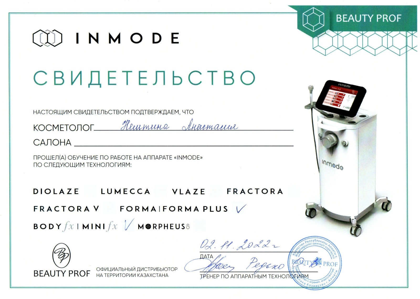 Прошла обучение по работе на аппарате «INMODE» по следующим технологиям: Forma/Forma plus, Bodyfx, Minifx.