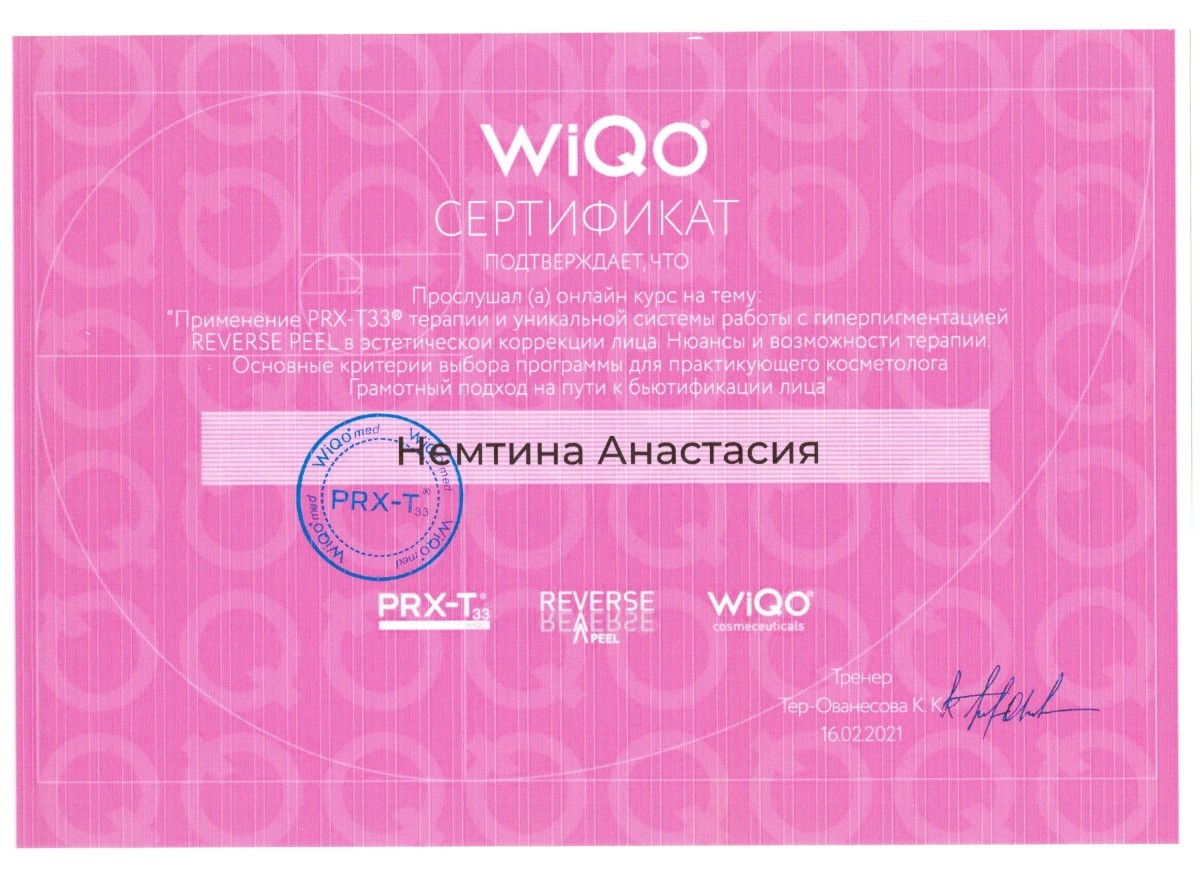 Прослушала онлайн курс на тему: «Применение PRX-T33 терапии и уникальной системы работы с гиперпигментацией REVERSE PEEL в эстетической коррекции лица. Нюансы и возможности терапии. Основные критерии выбора программы для практикующего косметолога. Грамотный подход на пути к бьютификации лица»