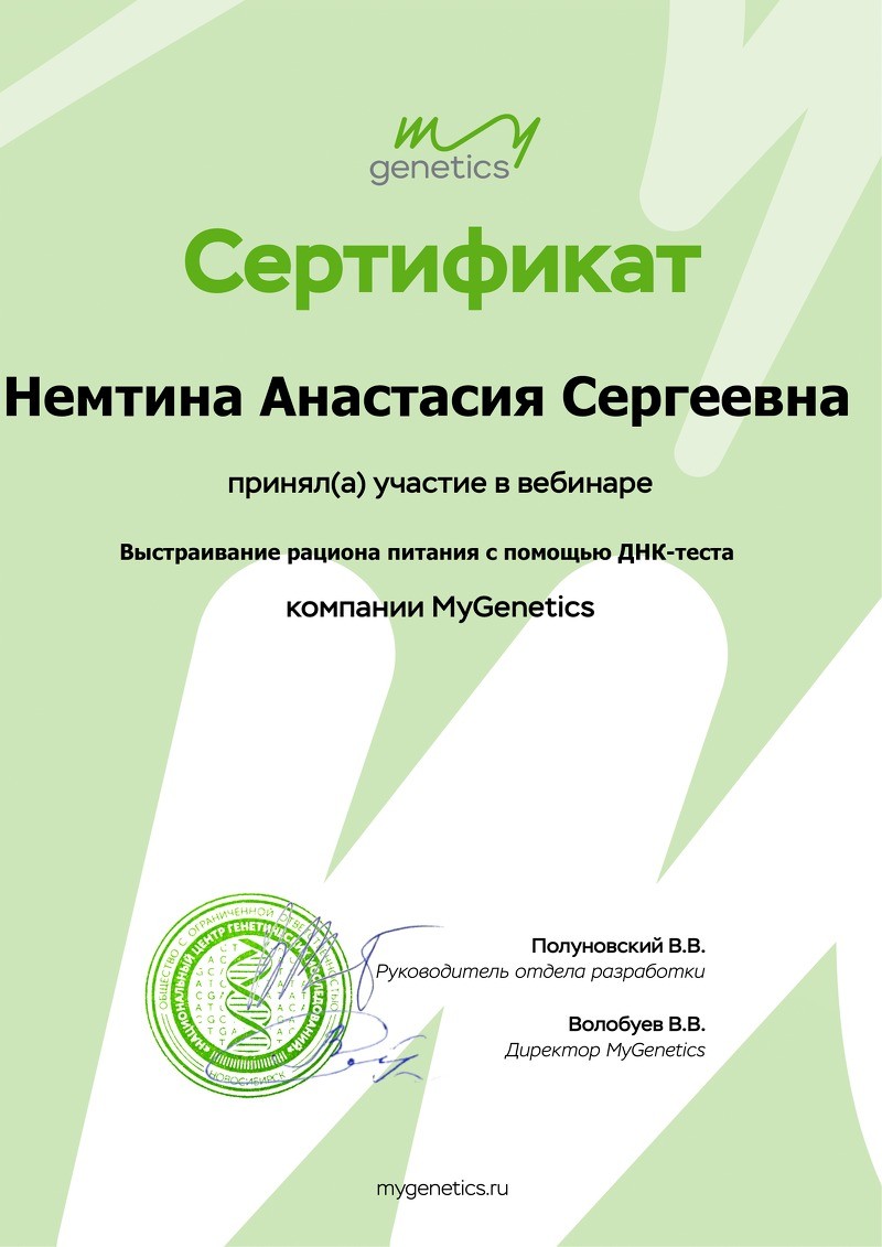 Приняла участие в вебинаре «Выстраивание рациона питания с помощью ДНК-теста компании MyGenetics»
