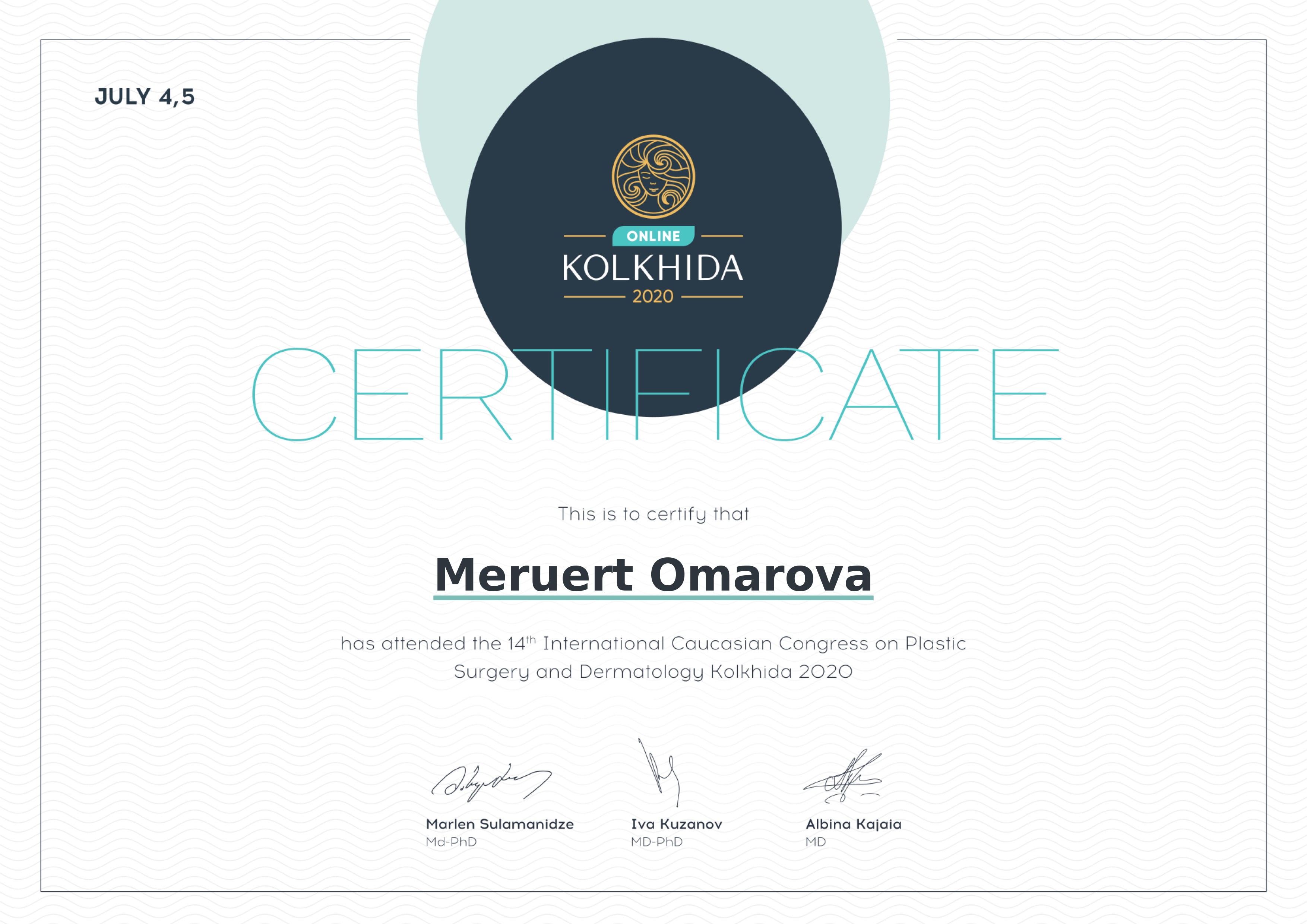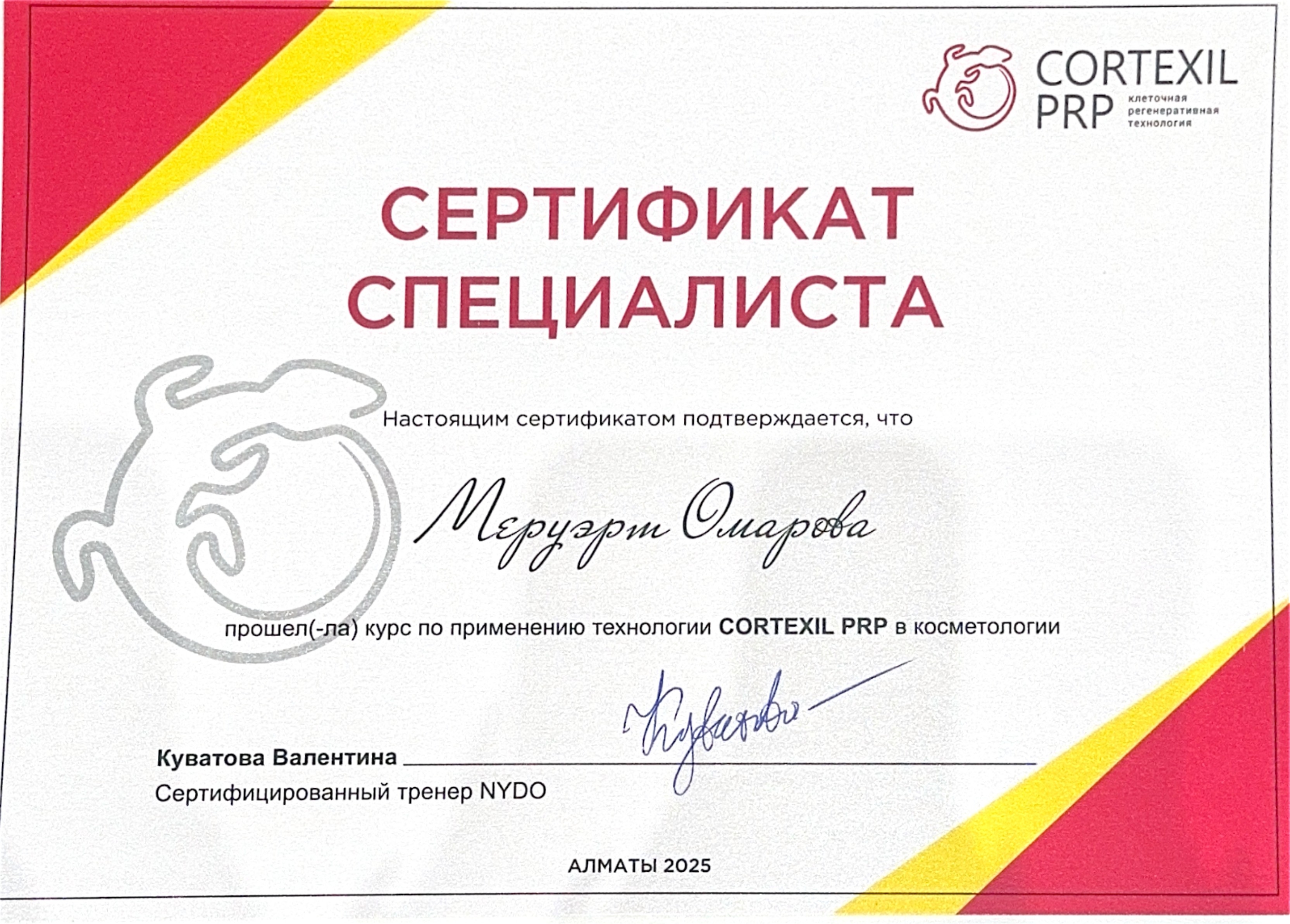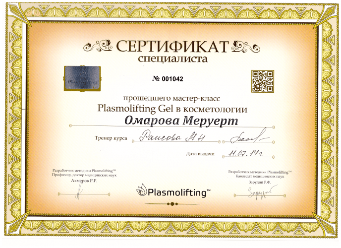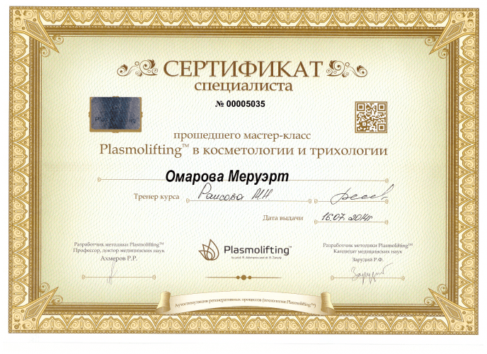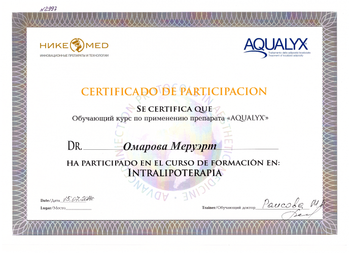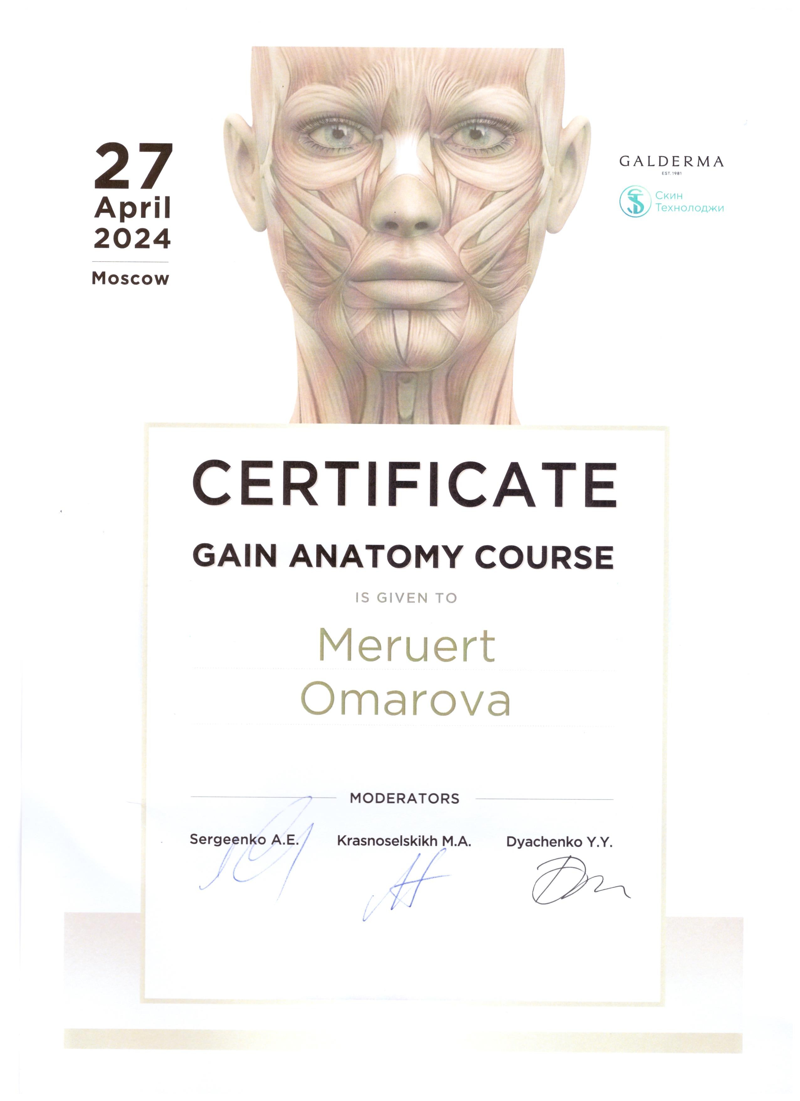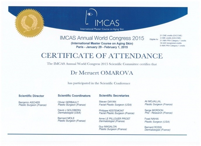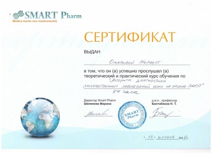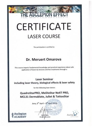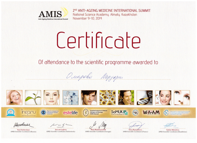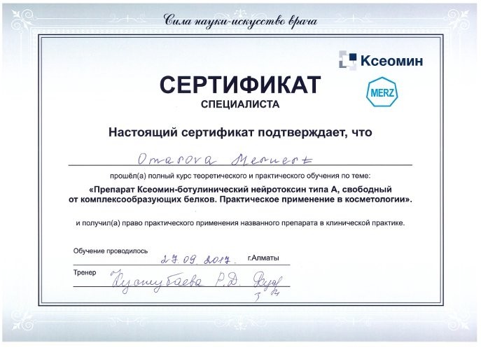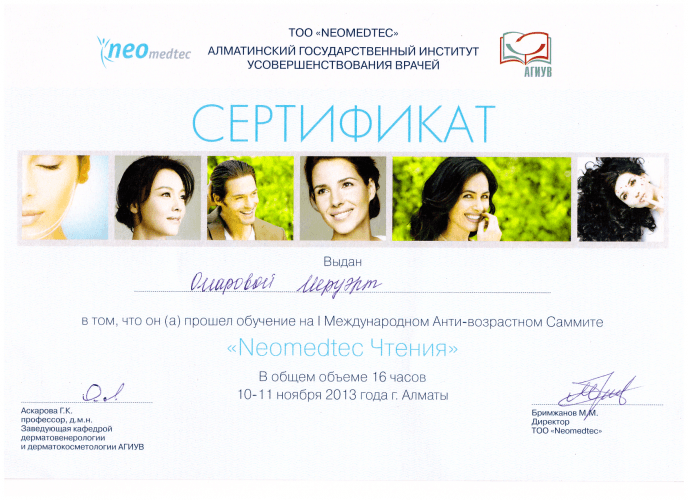 Переподготовка по специальности «Дерматовенерология», «Дерматокосметология». Каз НМУ им. С. Д. Асфендиярова, 2012—2013 гг.