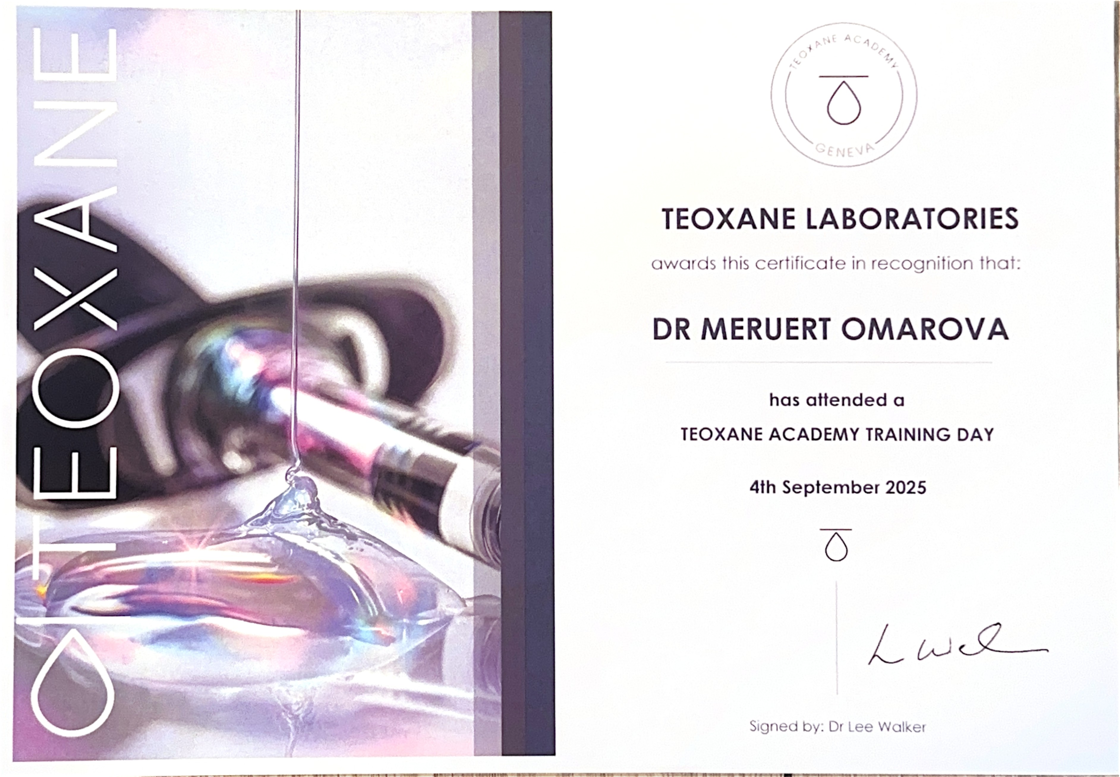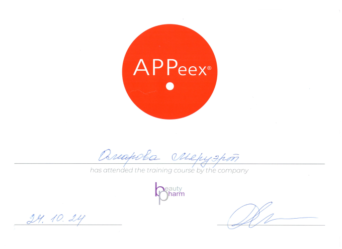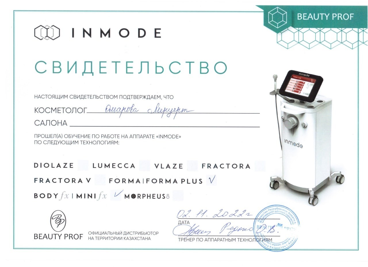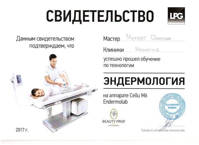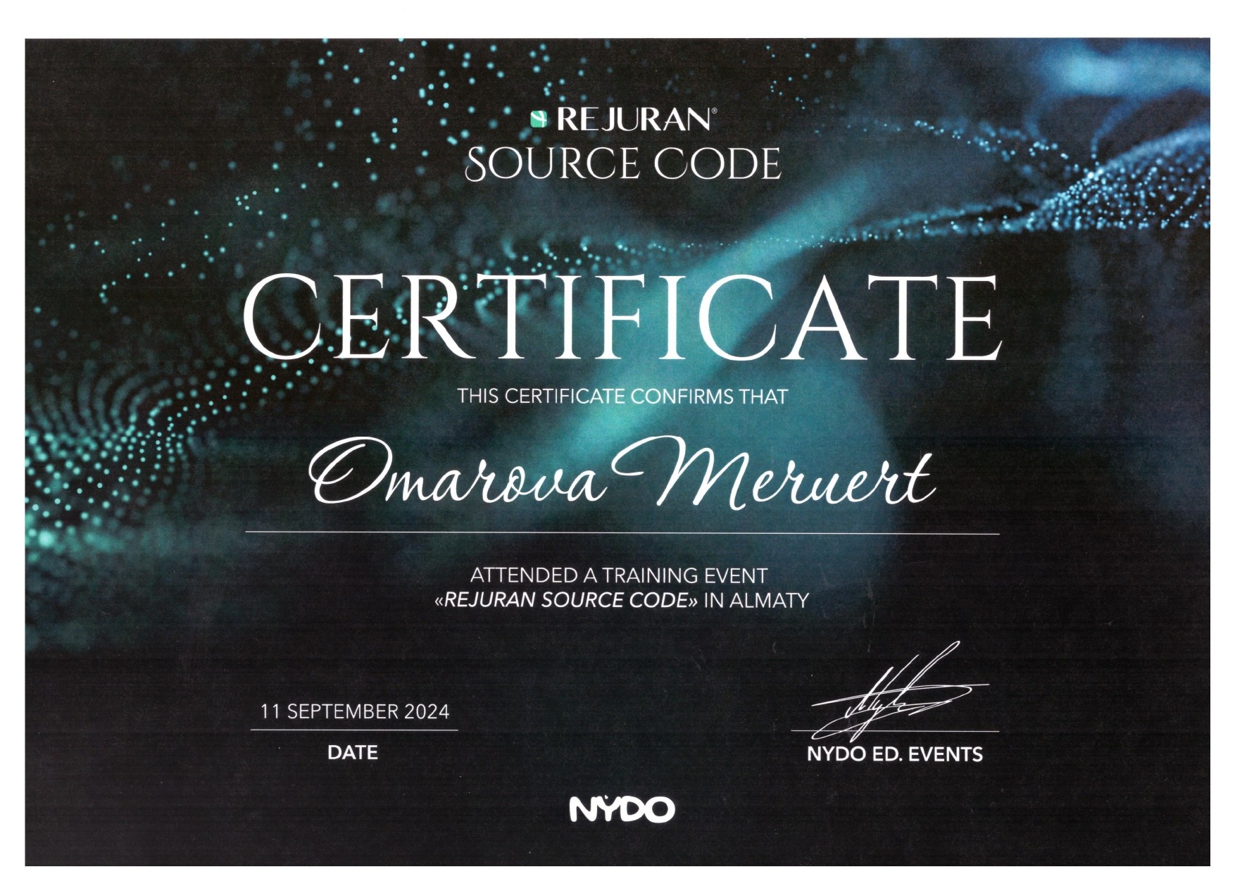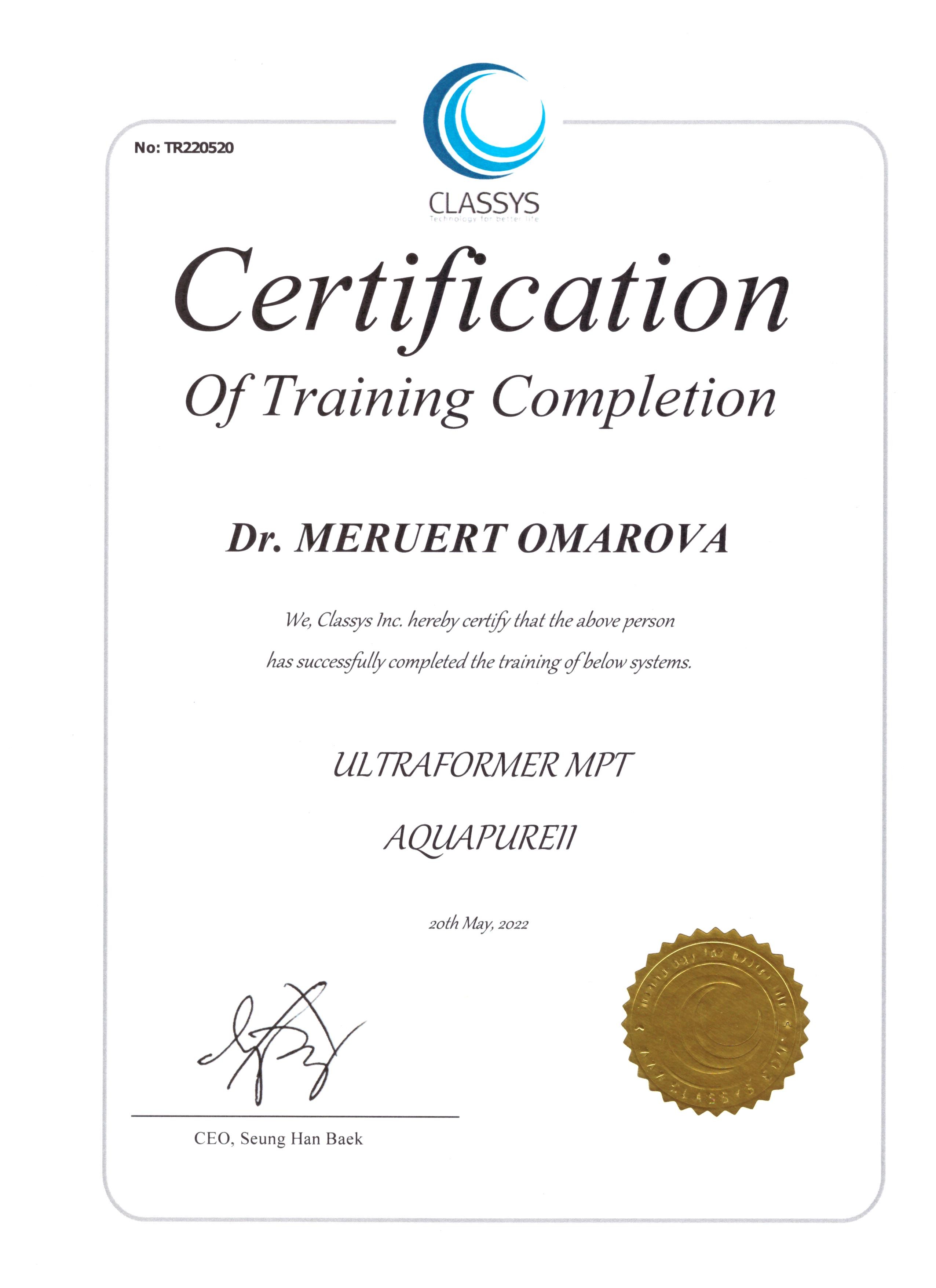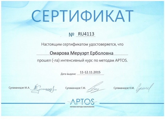 Переподготовка по специальности «Дерматовенерология», «Дерматокосметология». Каз НМУ им. С. Д. Асфендиярова, 2012—2013 гг.