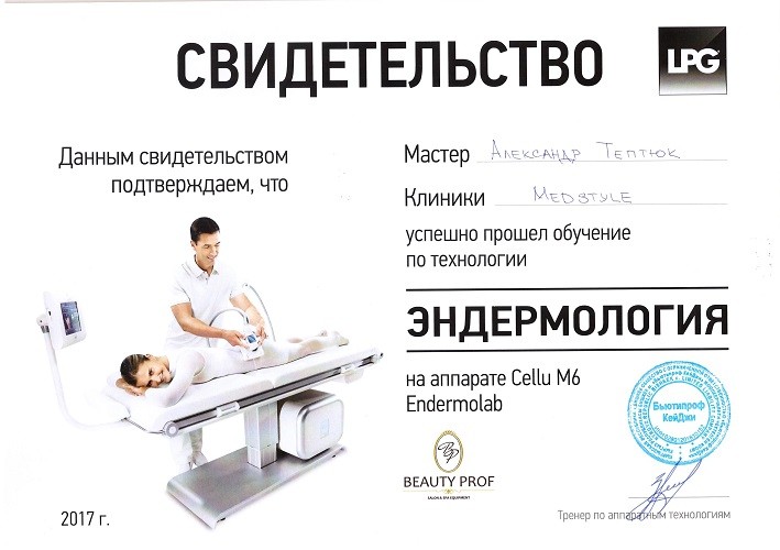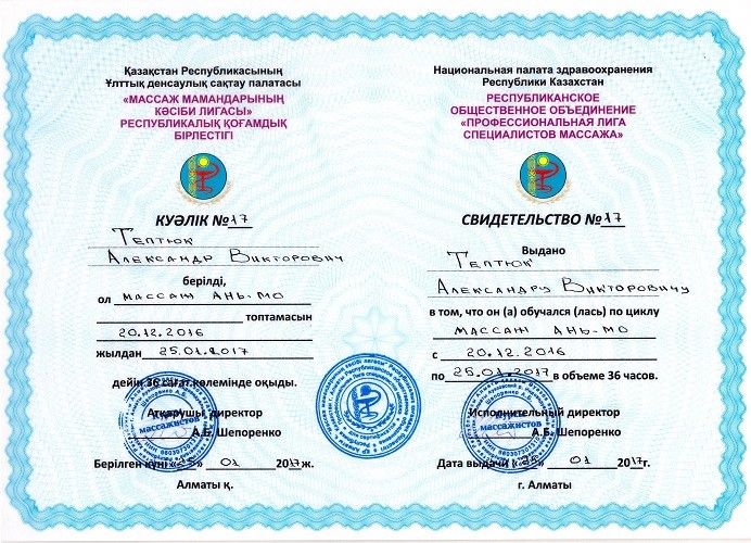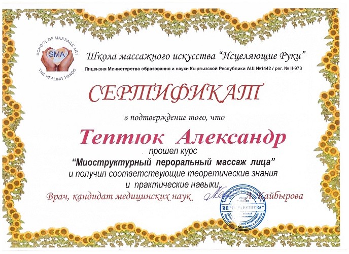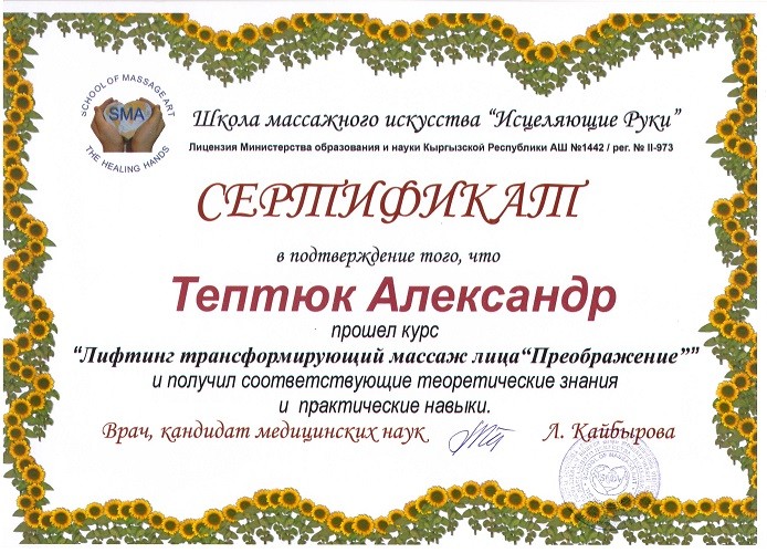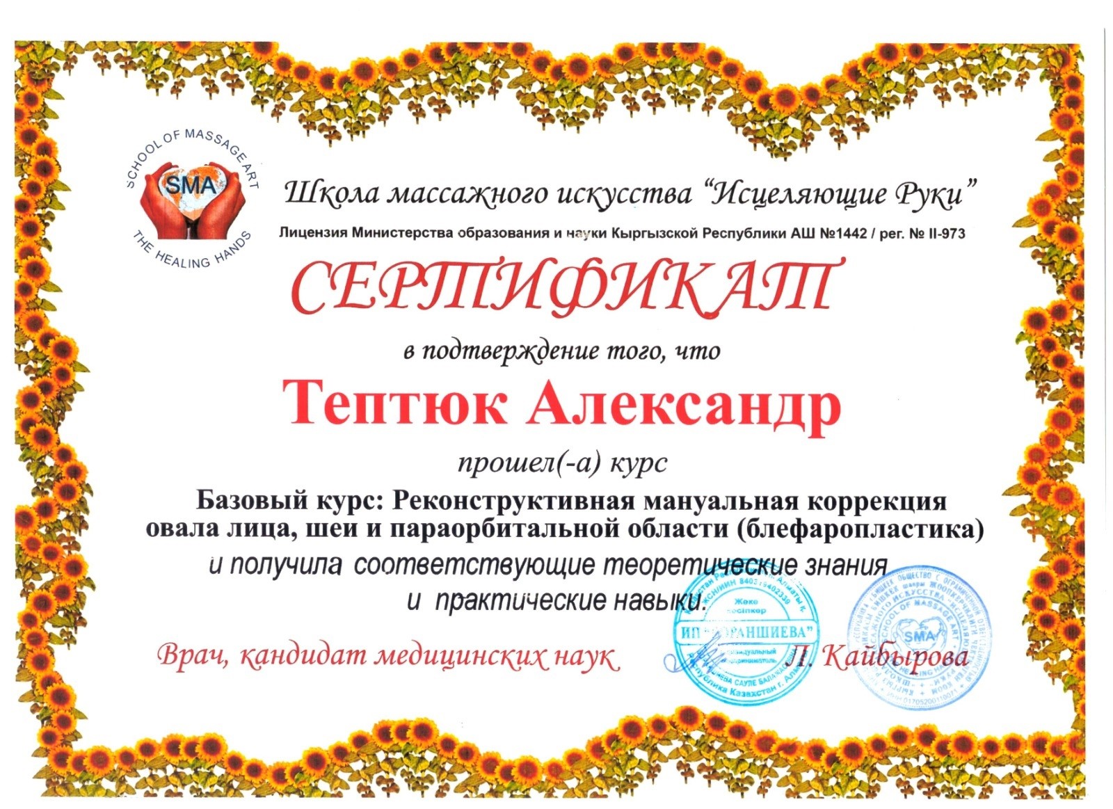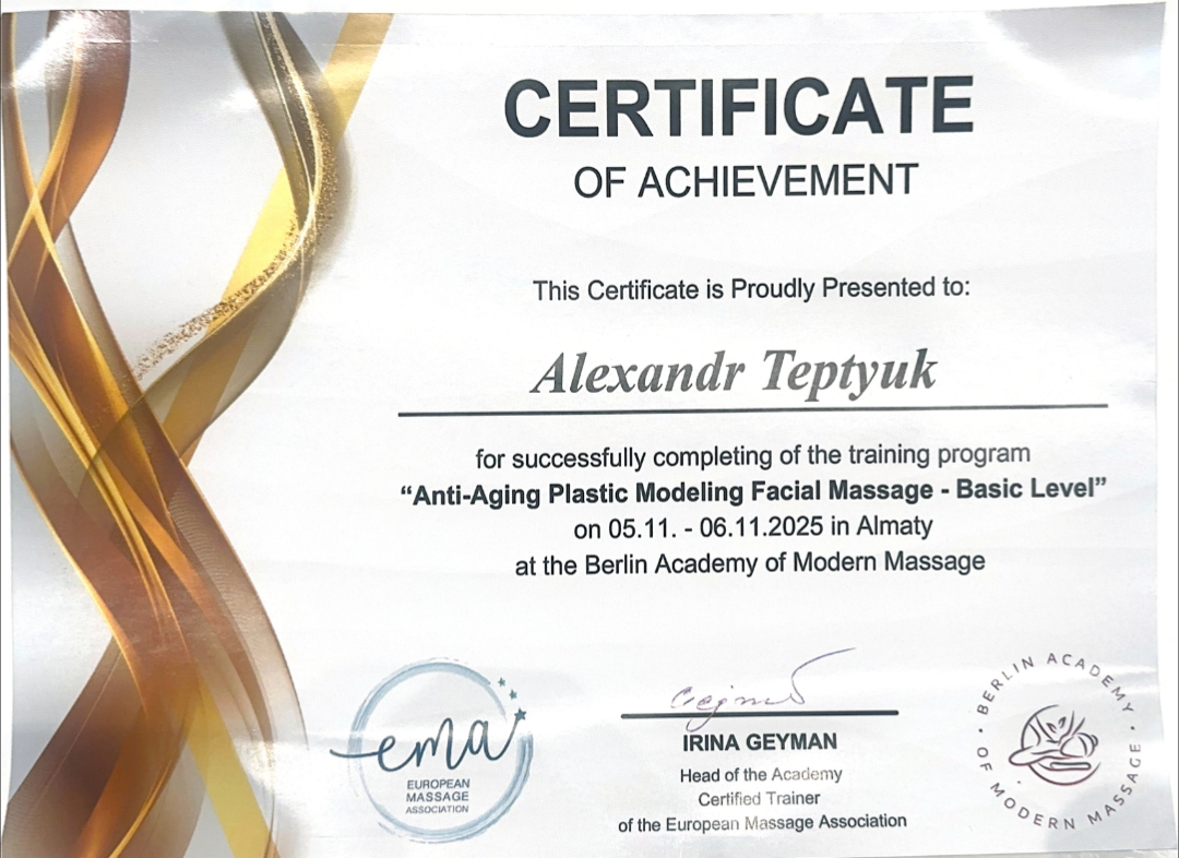 Сертификат о прохождении обучения "Anti-Aging Plastic Modeling Facial Massage - Basic Level"